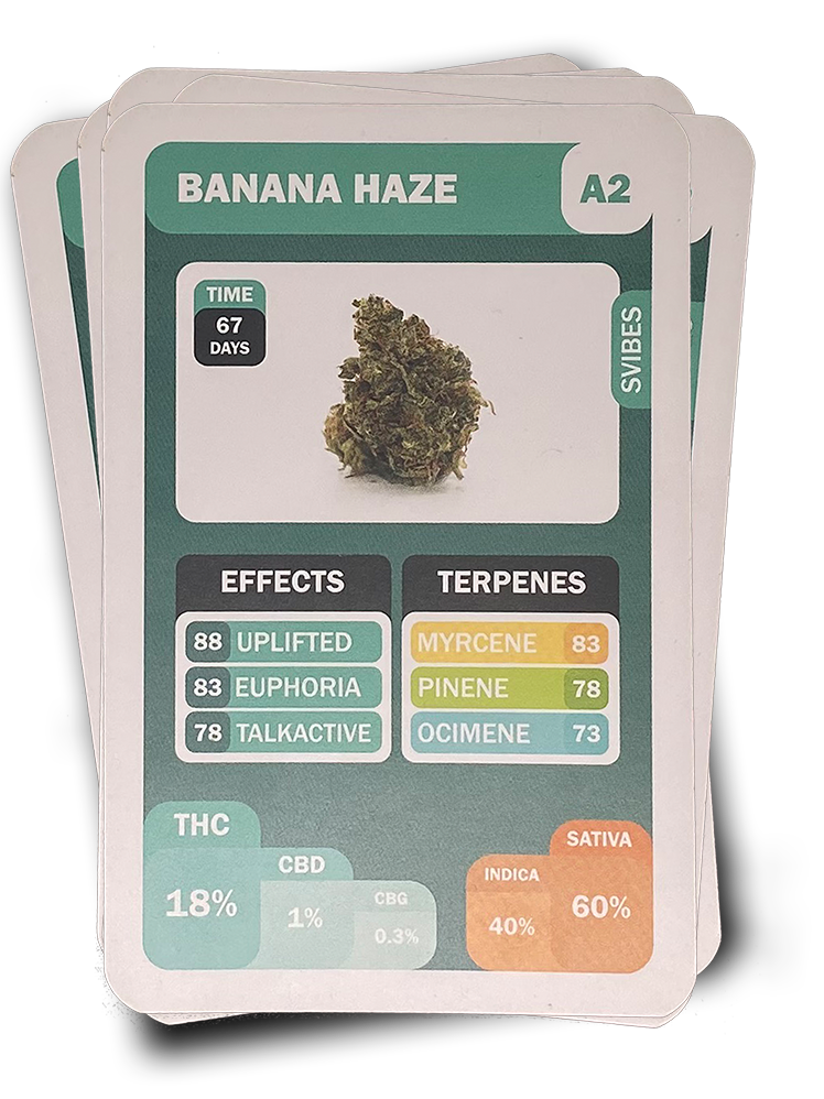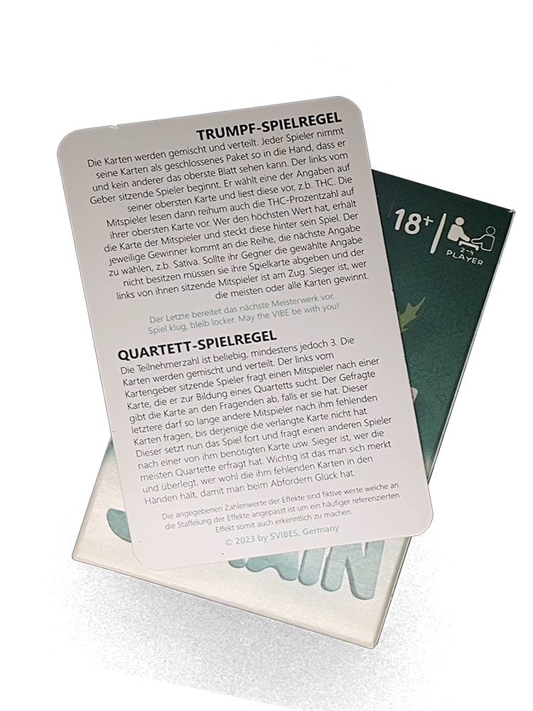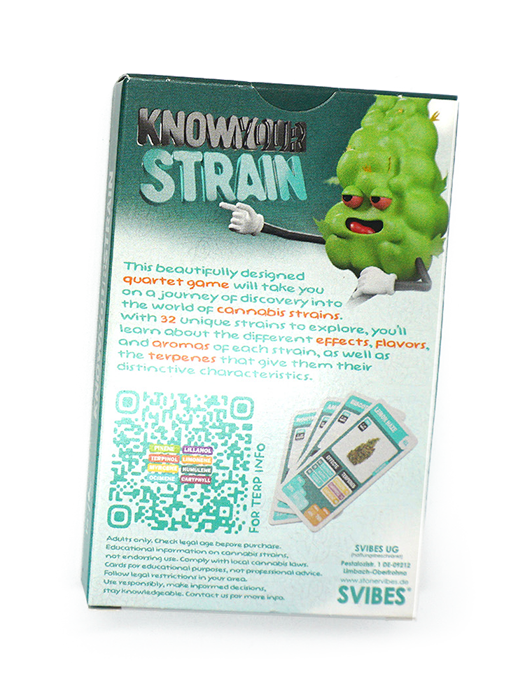 Das SVIBES® Know your Strain-Quartett ist das perfekte Spiel für gesellige Runden, als lehrreiches Tool für Cannasseure oder als Geschenk für Freizeit-Enthusiasten. Es fördert nicht nur den Spaß, sondern regt auch zum Nachdenken und Taktieren an. Mit variierenden Werten für einen ausgewogenen Spielspaß bietet es immer wieder neue Überraschungen und Wendungen.
